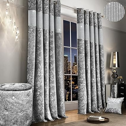 Glitter Crushed Velvet Fully Lined Ring Top Curtains Silver Grey